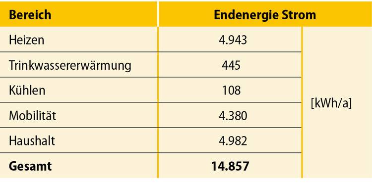 Das Energiekonzept sieht eine Elektrifizierung aller Verbrauchsbereiche vor. Damit kommt man auf einen jährlichen Strombedarf von rund 15 MWh (Abb. 6). Der Jahreslastgang zeigt, dass es sich bei dem in seiner Gebäudehülle energetisch optimierten Gebäudes um ein über das Jahr betrachtet konstanten Abnehmer handelt. So liegen lediglich Schwankungen in den Stromspitzen von wenigen Kilowatt vor.