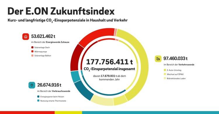 Verbraucher in Deutschland können einen wesentlichen Beitrag zur Energiewende leisten, indem sie die vorhandenen Potenziale in Bereichen wie Solar, E-Mobilität, Nahverkehr und Heizen ausschöpfen. Der neu vorgestellte "E.ON Zukunftsindex" zeigt die Möglichkeiten auf, wie bis zu 178 Millionen Tonnen CO2 jährlich eingespart werden könnten.