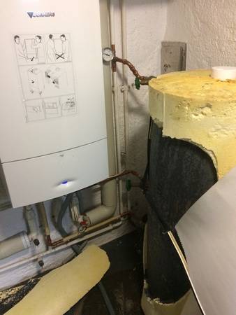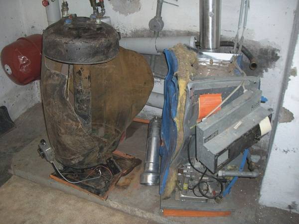 Dieser direktbefeuerte Gasboiler hat den Heizraum ganz ordentlich verwüstet. Auch die Gasleitung wurde bei dem Vorfall abgerissen. Ein Wunder, dass hier niemand zu Schaden kam. Gewartet war die Anlage offensichtlich schon lang nicht mehr geworden. Vielen Dank an S. Sohns!
