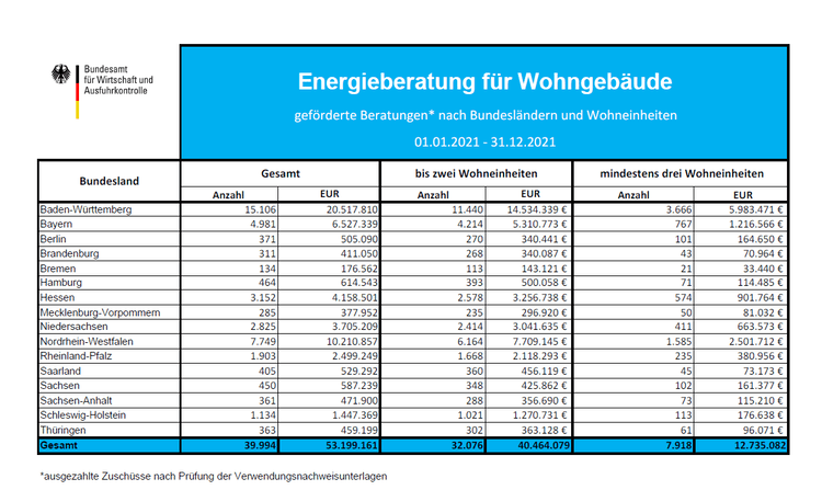 Der Rekordmonat bei der Energieberatung für Wohngebäude war der November 2021 mit deutlich über 8.000 Anträgen. In Baden-Württemberg werden nach wie vor mit Abstand die meisten Anträge gestellt, da der iSFP als Teilerfüllung des Landeswärmegesetzes EWärmeG gilt. Andere Länder holen aber auf, so lag in Nordrhein-Westfalen die Zahl der Beratungen bereits im Juni 2021 deutlich über denen des kompletten Vorjahrs. Schlusslichter bleiben nach wie die neuen Bundesländer.