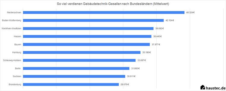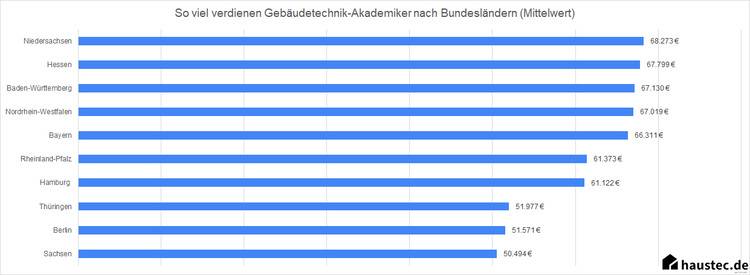 Wer einen akademischen Abschluss hat und in der Gebäudetechnik arbeitet, verdient laut unseren Ergebnisse in Niedersachsen am meisten. Danach folgen Hessen, Baden-Württemberg und Nordrhein-Westfalen.