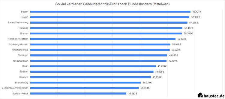 Hierzu hat haustec.de seit 2019 mehr 1.100 Profis aus der Gebäudetechnik in einer fortlaufenden Umfrage befragt. Was verdienen Gesellen, Meister, Techniker und Akademiker in den einzelnen Bundesländern?