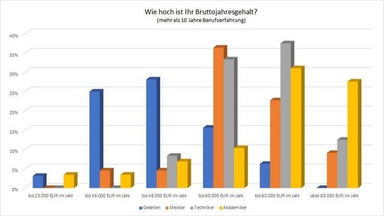 Mit einem durchschnittlichen Meistergehalt von 61.300 Euro jährlich, was einer Erhöhung von 1.920 Euro gegenüber dem Vorjahr (59.380 Euro) entspricht, werden Erfahrung, Führungstalent und umfangreiches Fachwissen honoriert.