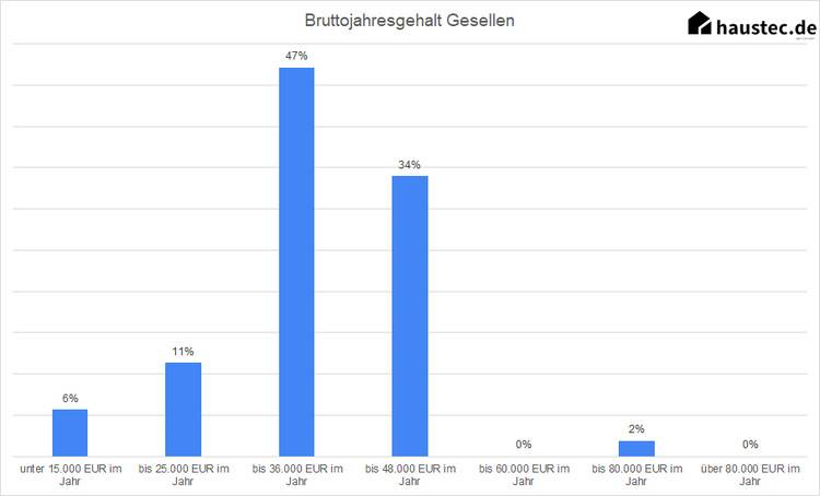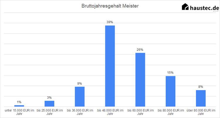 30 Prozent der Umfrageteilnehmer haben einen Meisterabschluss in der Tasche. Das bedeutet laut unserer Umfrage einen Bruttojahresverdienst von 54.295 Euro. In einzelnen Fällen ist jedoch deutlich mehr drin: 15 Prozent der Teilnehmer gab an, zwischen 60.000 Euro und 80.000 Euro zu verdienen.