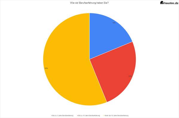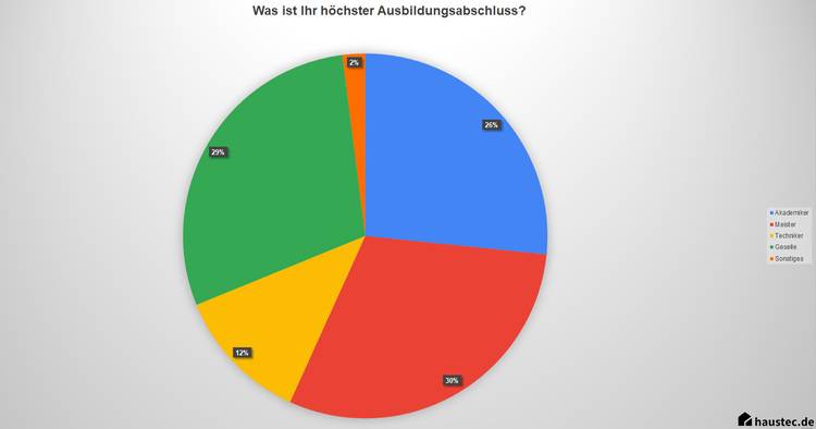 Neben ihrer Tätigkeit sind die Umfrageteilnehmer nach ihrem Ausbildungsabschluss befragt worden. Die Mehrheit bilden hier Handwerker (71 Prozent), allerdings mit unterschiedlichen Ausbildungsabschlüssen. Da sind es vor allem Gesellen und Meister, die an der Gehaltsstudie teilgenommen haben. Aber auch Techniker und Akademiker haben Angaben zu ihren Gehältern gemacht.