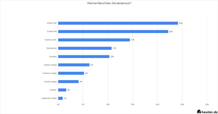 Die mehrheitlich männlichen Teilnehmer (97 Prozent) der Gehaltsstudie wurden zu Berufsabschluss, Berufserfahrung, Bundesland und natürlich Gehalt befragt. Mehr als die Hälfte der Befragten ist in der SHK-Branche beschäftigt, die innerhalb der Gebäudetechnik-Branche auch den Großteil ausmacht. Dazu kommen Bauingenieure sowie Gesellen, Meister und Techniker aus anderen Gewerken.