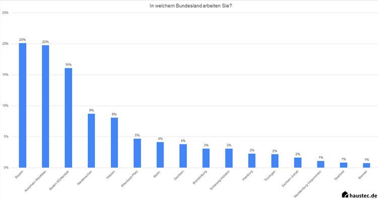 Die meisten Umfrageteilnehmer kommen aus Nordrhein-Westfalen, Bayern, Baden-Württemberg und Niedersachsen. Das entspricht auch der hohen Bevölkerungsdichte und großen Fläche dieser Bundesländer. Bremen, das Saarland und Mecklenburg-Vorpommern bilden hier die Schlusslichter.
