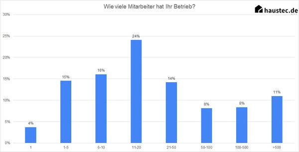 Das schlägt sich auch in der Berufserfahrung nieder. Mehr als die Hälfte der Teilnehmer hat eine Berufserfahrung von mehr als zehn Jahren. Fast die Hälfte der Befragten hat dabei Personalverantwortung – die mit zunehmender Betriebsgröße steigen dürfte. Eine Beschäftigung in großen Unternehmen bleibt in unserer Studie die Ausnahme. Die meisten Umfrageteilnehmer sind in KMU mit bis zu 100 Angestellten beschäftig oder arbeiten in Kleinstunternehmen mit bis zu 10 Mitarbeitern.