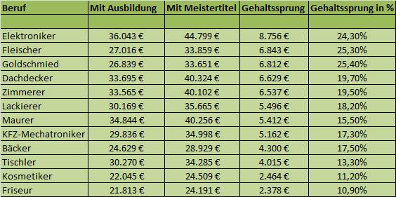 Die Ergebnisse zeigen, dass es sich vor allem für Elektroniker lohnt, die Zusatzqualifikation Meister in Angriff zu nehmen. Mit einem Meistertitel erhöht sich das Einkommen auf 44.800 Euro. Zimmerer (40.100 Euro), Maurer (40.300 Euro) oder Dachdecker (40.300 Euro) erreichen mit dem Titel ebenfalls Gehälter von über 40.000 Euro im Jahr. Goldschmiede und Dachdecker steigen in ihrem Gehalt nach dem Meister um 6.800 Euro beziehungsweise 6.600 Euro.