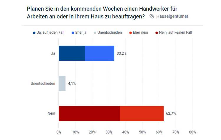4,1 % der befragten Hausbesitzer sind derzeit unentschieden, was die Beauftragung eines Handwerkers angeht. Die große Mehrheit (62,2 %) schließt es allerdings aus, in den kommenden Wochen auf die Unterstützung eines Fachmanns aus der Handwerksbranche zurückzugreifen. Während 26,2 % auf die Frage mit "Eher nein" antworteten, schlossen es 36,5 % mit der Antwort "Nein, auf keinen Fall" kategorisch aus.