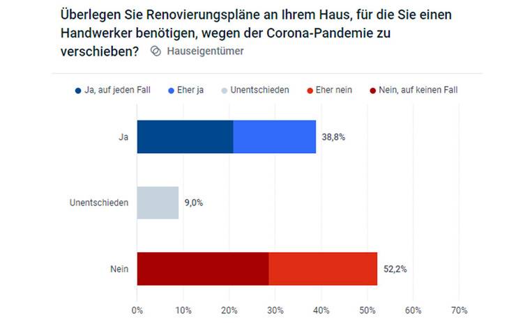 Bei der Frage, inwieweit Hausbesitzer erwägen, aufgrund der Corona-Pandemie Renovierungspläne am Haus zu verschieben, zeigt sich ein etwas anderes Bild: Etwas mehr als die Hälfte der Befragten (52,2 %) haben nicht vor die Renovierung zu verschieben. 29,1% entschieden sich dabei für "Nein, auf keinen Fall", 23,3% für "Eher nein".