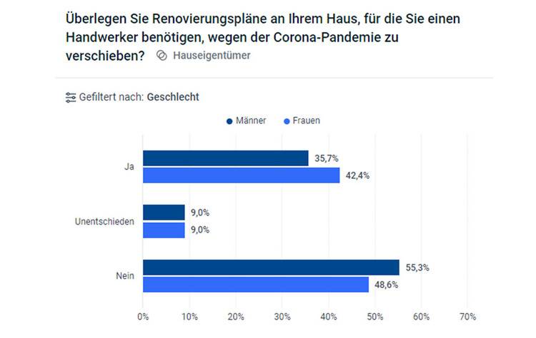 Die Frauen unter den Hausbesitzern scheinen indes etwas vorsichtiger zu sein: 42,4 % von ihnen planen, Maßnahmen mit Handwerkereinsatz zu verschieben, während es bei den Männern nur 35,7 % sind. Jeweils 9 % der beiden Geschlechter sind unentschieden. Folglich halten 48,6 % der Frauen eine Verschiebung für nicht nötig, während es bei den Männern 55,3 % sind.