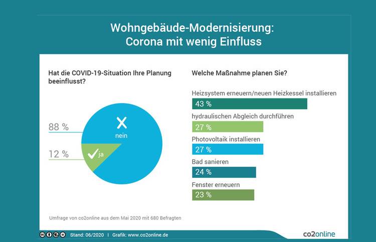 Die Corona-Krise hat nur wenig Einfluss auf das Modernisieren von Wohngebäuden. Das geht aus einer Verbraucher-Umfrage der gemeinnützigen Beratungsgesellschaft co2online hervor. Rund 88 Prozent der Befragten gaben an, dass die Corona-Krise ihre Entscheidung für eine Sanierung nicht beeinflusst habe.