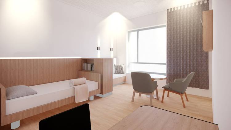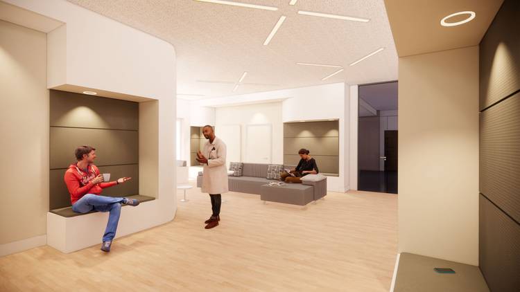 Alexander Ernst: Wir haben zusammen mit den Ärztinnen und Ärzten und dem Pflegefachpersonal eine Hierarchie von Gemeinschaftsräumen und Rückzugsorten entwickelt. Um das Stationszentrum – die Leitstelle mit angrenzendem Backoffice - herum, von wo aus die Flure einsehbar sind, liegen die großen Gemeinschaftsbereiche. Den großen Raum haben wir aufgegliedert, um Sitznischen, Ruhebereiche oder Rückzugsräume zu schaffen. Auch in den Fluren gibt es verschiedene Nischen mit Sitzbänken, was gleichzeitig Offenheit schafft und Rückzugsmöglichkeiten bietet. Benötigt ein Patient absolute Ruhe, bleibt sein Zimmer als Rückzugsort.