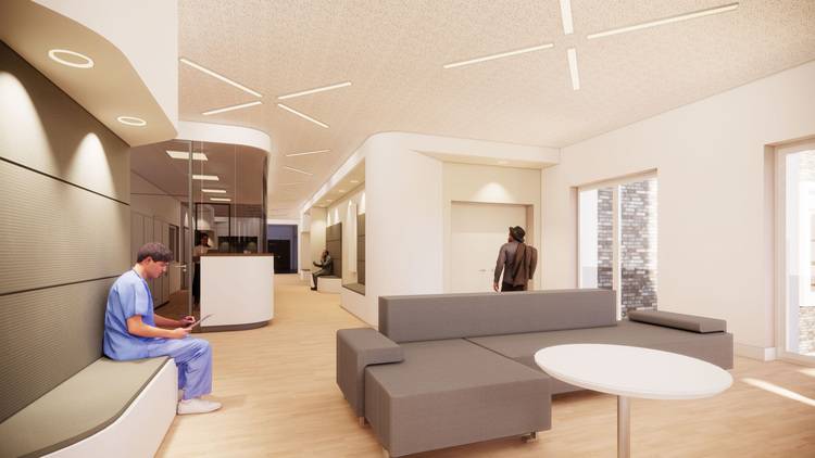 Die dritte freie Fläche ist die Anfahrt, auch für die Notfälle, die per RTW gebracht werden. Dies erfolgt bisher über den Haupteingang des Krankenhauses, wo ganz viele Personen diese beklemmenden Situationen mitbekommen können. Das möchten wir beim Neubau vermeiden. Bei der Gestaltung haben wir darauf geachtet, einen geschützten Platzbereich zu schaffen, der auch eine Sichtbarriere zum eigentlichen Eingang bietet. Gleichzeitig bildet diese Fläche das Entree für Besucher und Patienten und den Aufenthaltsbereich für die Patienten in den oberen Etagen.