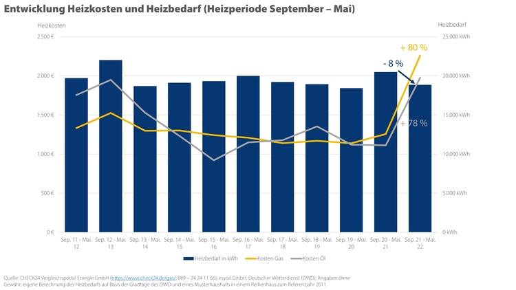 Ein Haushalt mit einer Gasheizung zahlte von September bis Mai 2.256 Euro und damit 80 Prozent mehr als in der Heizperiode zuvor. Verbraucher*innen mit Ölheizung mussten mit 1.975 Euro rund 78 Prozent mehr zahlen als in der Vorjahresperiode.