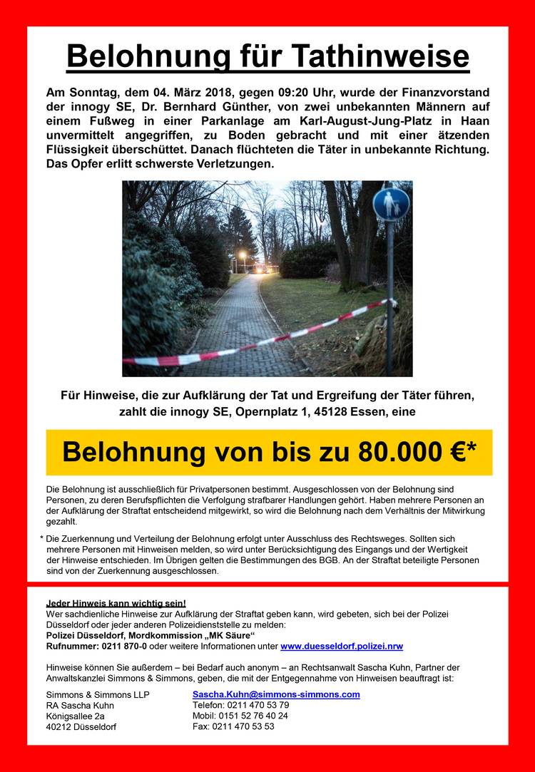 Die Innogy SE hat eine Belohnung von bis zu 80.000 Euro ausgesetzt für Hinweise, die zur Aufklärung des Säure-Anschlags auf Finanzvorstand Bernhard Günther und zur Ergreifung der nach wie vor unbekannten Täter führen. Hintergrund ist die Entscheidung der Staatsanwaltschaft Wuppertal, die am 28. September 2018 bekannt gegeben hat, das Ermittlungsverfahren wegen des Säureattentats auf Bernhard Günther einzustellen, da die Täter nicht ermittelt werden konnten. Die Staatsanwaltschaft hat zeitgleich zugesichert, das Verfahren wieder aufzunehmen, sollten sich neue Ermittlungsansätze ergeben.