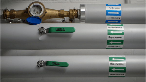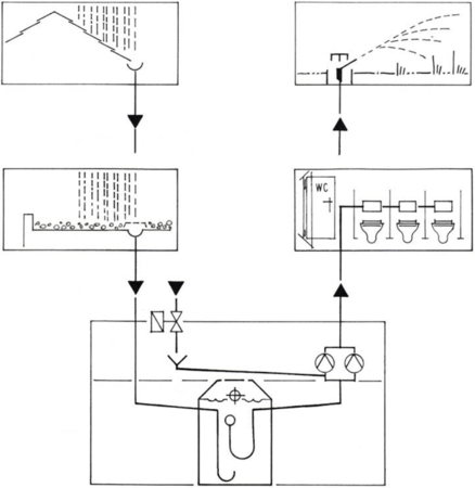 Regen- und Grauwassernutzungsanlagen: Sie bestehen aus den vier wesentlichen Elementen Sammlung, Behandlung, Speicherung und Verteilung. Eine Genehmigung ist in Deutschland nicht erforderlich. Allerdings besteht Anzeigepflicht vor dem Bau einer Anlage beim Wasserversorger und beim Gesundheitsamt.