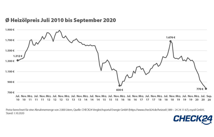 2.000 Liter Heizöl kosteten im September im Schnitt 770 Euro. Das ist der niedrigste Preis seit zehn Jahren. Warum Verbraucher ab Januar 2021 dennoch mehr zahlen.