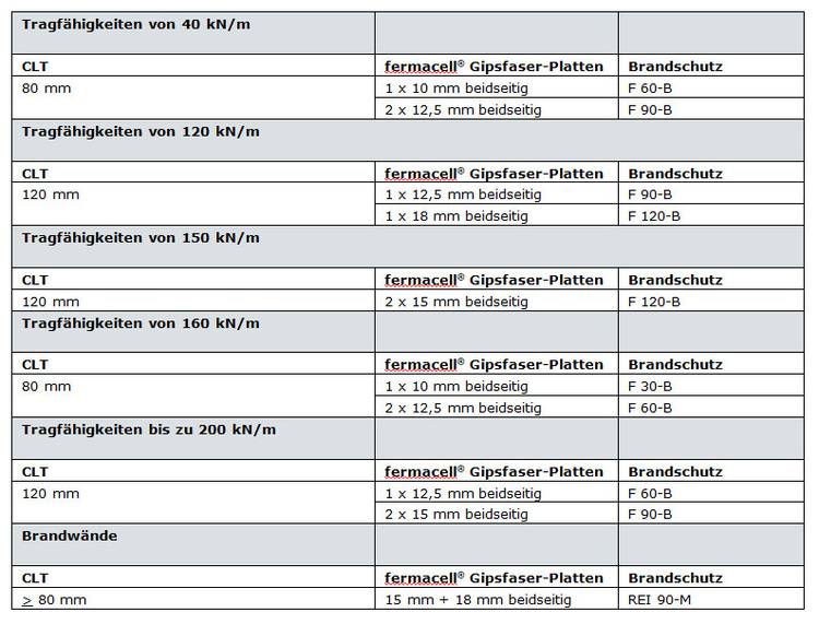 Die Kombination von hohem Brandschutz und sehr hohen Tragfähigkeiten (bis zu 200 kN/m) gelingt durch die beidseitige Beplankung von 120 mm CLT mit 1 x 12,5 mm fermacell-Gipsfaser-Platten (F60-B) oder alternativ mit 2 x 15 mm Gipsfaser-Platten (F90-B). Hohe Tragfähigkeiten von 120 bzw. 150 kN/m werden erreicht, wenn die 120 mm dicke Brettsperrholz-Konstruktion auf beiden Seiten eine Beplankung aus 1 x 12,5 mm, 1 x 18 mm oder 2 x 15 mm fermacell-Gipsfaser-Platten erhält. Dabei erreicht die Ausführung mit 1 x 18 mm bzw. 2 x 15 mm Gipsfaser-Platten die Feuerwiderstandsklasse F120-B.