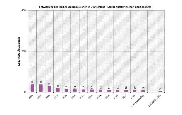Die Emissionen des Abfallsektors sanken gegenüber dem Vorjahr um 0,5 Mio. Tonnen bzw. um 4,7 %. Der Trend wird bestimmt durch die Emissionen der Abfalldeponierung, die um 5,9 % weiter zurückgingen. Bei den anderen Kategorien gibt es kaum Veränderungen.
