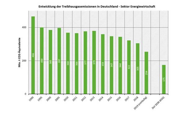So lag der Durchschnittspreis für eine Tonne CO2 2019 mit 24,65 Euro fast doppelt so hoch wie 2018. In der Folge war der Betrieb von Kohlekraftwerken 2019 häufig teurer als der von Gaskraftwerken. 2019 wurden Steinkohlekraftwerke mit insgesamt 3,5 Gigawatt Leistung stillgelegt oder in die Netzreserve überführt. Auch die in die Sicherheitsbereitschaft übernommenen Braunkohle-Kraftwerksblöcke im Oktober 2018 und im Oktober 2019 haben zur Minderung beigetragen.