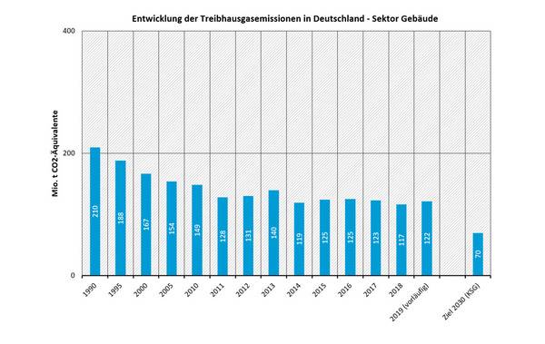 Die Emissionen aus dem Gebäudebereich stiegen im Vergleich zum Vorjahr um 5 Mio. Tonnen an (plus 4,4 %). Ein wesentlicher Treiber des Emissionsanstiegs sind die gegenüber dem Vorjahr deutlich gestiegenen Heizölabsätze. Das lag vor allem am Preis: 2019 war der Heizölpreis deutlich niedriger als 2018. Daneben spielte auch die Witterung eine Rolle: Nach dem außergewöhnlich warmen Jahr 2018 war das Jahr 2019 in vielen Teilen Deutschlands wieder etwas kühler.
