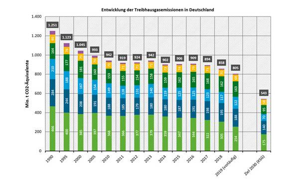 In Deutschland wurden 2019 rund 805 Millionen Tonnen Treibhausgase freigesetzt – das sind rund 54 Millionen Tonnen oder 6,3% weniger als 2018. Das zeigt die vorläufige Treibhausgas-Bilanz des Umweltbundesamtes (UBA).