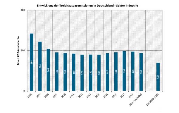 Im Sektor Industrie gehen die Emissionen gegenüber dem Vorjahr um über 7 Mio. Tonnen CO2-Äquivalente zurück (minus 3,7 Prozent). Zum großen Teil ist dieser Rückgang der rückläufigen Brennstoffnutzung in den Industriefeuerungen und der geringeren Stromerzeugung in den Industriekraftwerken zuzuordnen. Im Bereich der Prozessemissionen sanken diese insbesondere in der Stahlindustrie. In der mineralischen Industrie, wie auch in der chemischen Industrie ergeben sich ebenfalls leichte Rückgänge der Treibhausgasemissionen