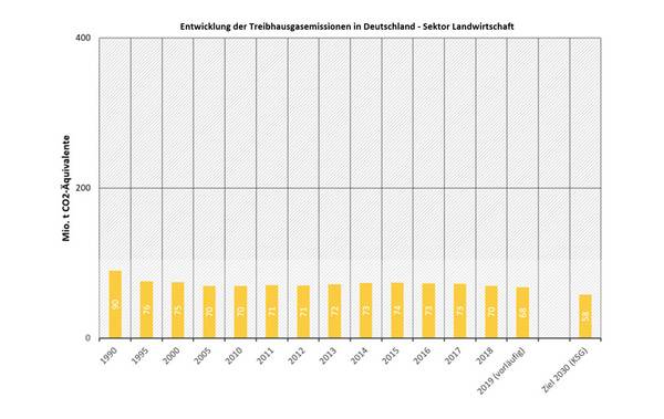 Im Sektor Landwirtschaft gingen die Treibhausgasemissionen um 2,3 % auf 68,2 Millionen Tonnen CO2-Äquivalente zurück. Gründe dafür sind sinkende Tierbestände bei Rindern (-2,6 %) und bei Schweinen (-2,0 %) sowie ein um 10,3 % zurückgegangener Mineraldüngerverkauf. Die beobachtbaren Effekte können nach ersten Analysen zum einen auf die Folgen der sehr trockenen Witterung zurückzuführen sein (insb. Tierfuttermittelverfügbarkeit), zum anderen auf geringe Marktpreise und die Verschärfung der Düngeverordnung von 2017.