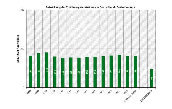 Die Treibhausgasemissionen des Verkehrs liegen mit 163,5 Mio. Tonnen CO2 auf einem leicht höheren Niveau als im Vorjahr (+1,2 Mio. Tonnen bzw. +0,7 %). Zwar kamen sparsamere Fahrzeuge auf den Markt, gleichzeitig nahm aber auch der Kfz-Bestand zu (+1,6%), sodass in Summe mehr Benzin und Diesel verbraucht wurde.