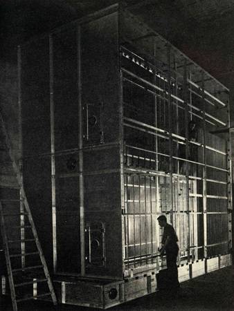 Düsenkammer (Luftwäscher mit einem Volumenstrom von 320.000m3/h und einer Höhe von 5,50m) zur Luftbefeuchtung einer Industrie-Klimaanlage von 1970.