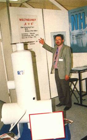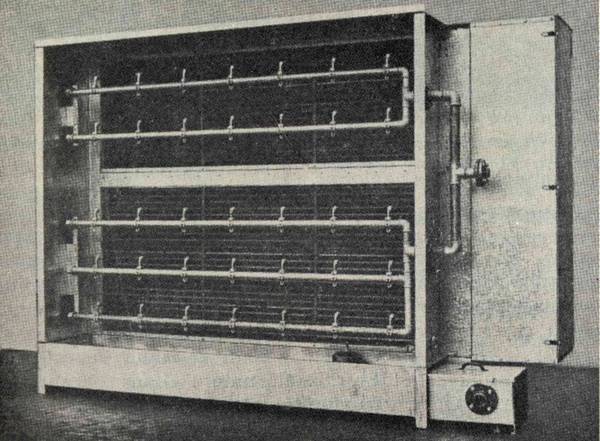 Luftkühler für direkte Verdampfung von Frigen, verbunden mit einer Befeuchtungseinrichtung (1970). Die Luftbefeuchtung für den Winterbetrieb erfolgte hier dadurch, dass die berippte Oberfläche mit Wasser besprüht wurde.