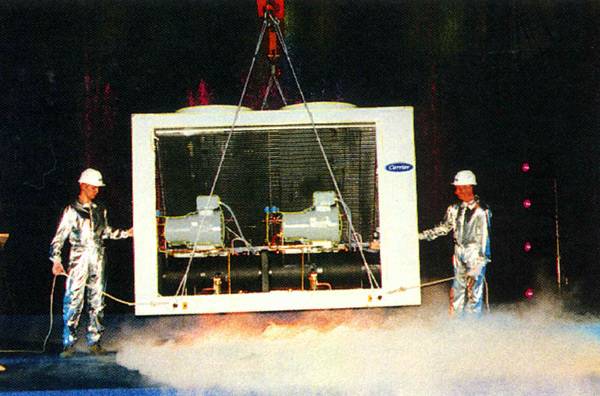 Carrier-Fachpresse-Konferenz am 18.12.1996: Begleitet von einer Laser-Bild-Show schwebt der neue Global Chiller in luftgekühlter Bauform mittels Schwerlastkran aus dem Carrier-Himmel.