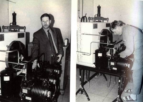 Ein technischer Leckerbissenn aus den 80-ern: Als Einzelauftrag gefertigtes luftgekühltes Spezialaggregat (Normal- und Tiefkühlung) für die Firma Rieger. Drei Verdichter auf einem Chassis; einer davon bestimmt zur Tiefkühlung mit Kältemittel R507, zwei Verdichter für die Normalkühlung mit Kältemittel R134a. Verflüssiger mit zwei Kreisläufen.
