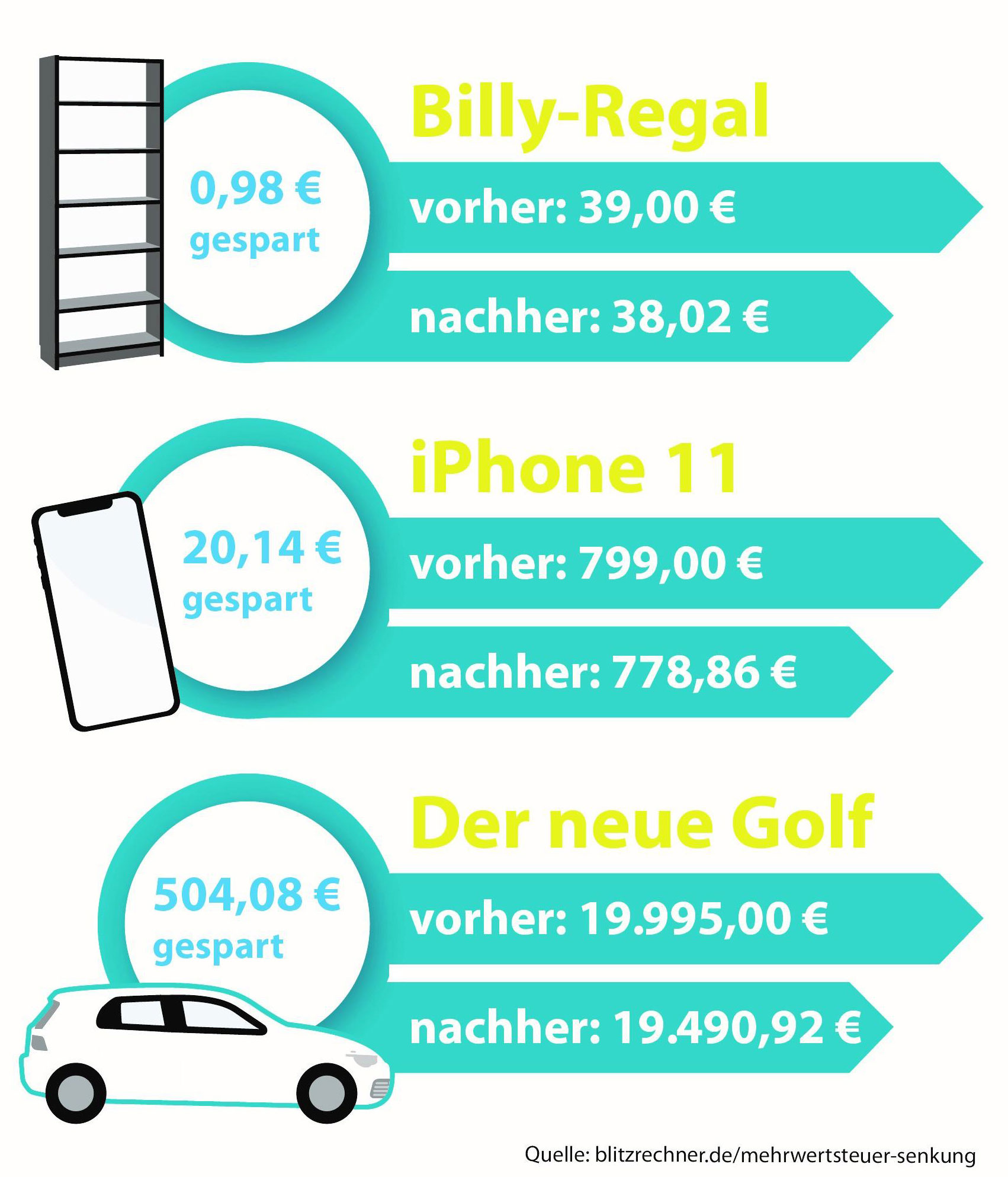 Der Wunsch der Bundesregierung: Händler sollen die Mehrwertsteuersenkung an die Verbraucher weitergeben. Ist dies der Fall, könnten Konsumenten Geld sparen. Beim Kauf des neuen Golf würden bei 16 Prozent Mehrwertsteuer noch 19.490,92 Euro fällig (Preisbeispiel) - 504,08 weniger als vorher. Auch beim Kauf eines neuen iPhone 11 könnten Konsumenten mehr als 20 Euro einsparen: Bei einem alten Preis von 799 Euro inklusive 19 Mehrwertsteuer würde es ab Juli 778,86 Euro kosten - 20,14 Euro weniger als vorher. Beim Billy-Regal zum jetzigen Preis von 39 Euro würden Käufer immerhin noch 98 Cent sparen. Denn nach Mehrwertsteuersenkung betrüge der neue Preis 38,02 Euro. Soweit zumindest die Theorie.