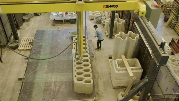 Alle Bauteile des ersten Hauses werden im Beton-Drucker der Universität Eindhoven hergestellt und dann zur Baustelle transportiert. Im Lauf der Bauzeit der Siedlung soll dieser Prozess nach und nach komplett auf die Baustelle verlagert werden, d.h. das letzte Hauses soll direkt vor Ort gedruckt werden.