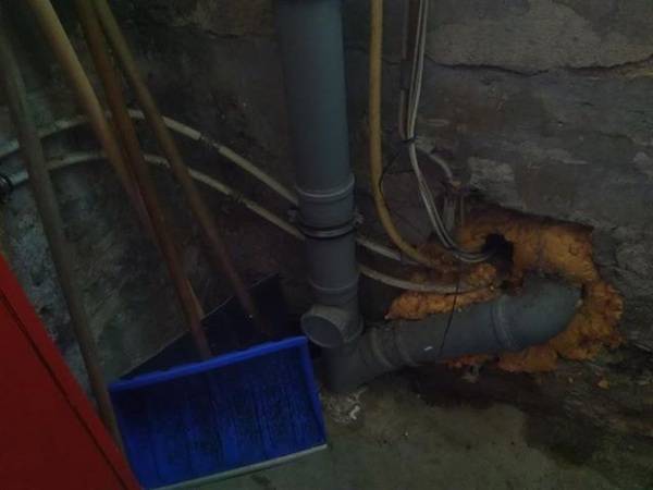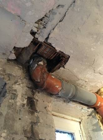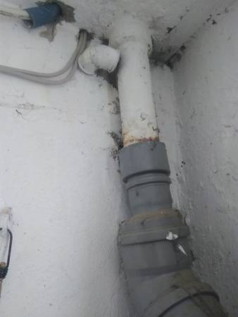 Von D. Loh bei einer Altbausanierung gefunden. Der Fallleitungsverzug wurde immerhin mit 45 Grad ausgeführt, nur leider das falsche Rohr... und die Abdichtung mit Bitumenbahn sowie die schalltechnische Befestigung sind wirklich vorbildlich.