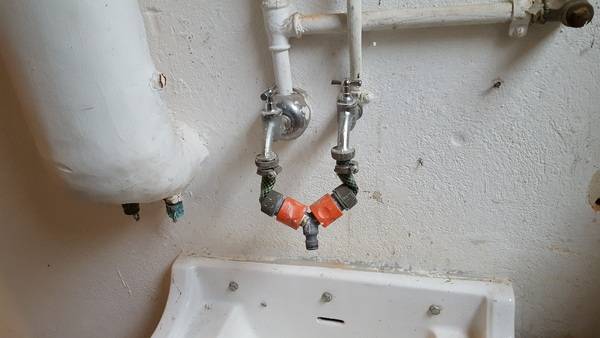 Die älteren Monteure unter uns kennen noch diese "Leerrohre". Damals wurden sie außen an den Hausfassaden hochgeführt, meistens bis zum Dach. Teilweise lief sogar Regenwasser aus den Dachrinnen durch diese senkrechten Kanäle! Jedenfalls kann man bis heute Top-Installationen darin ausführen und brauchte nicht immer durchs Haus. Im Winter sperren sich die hier gezeigten, wasserführenden Leitungen dann von selber ab. Herzlichen Dank an A. Döhring!