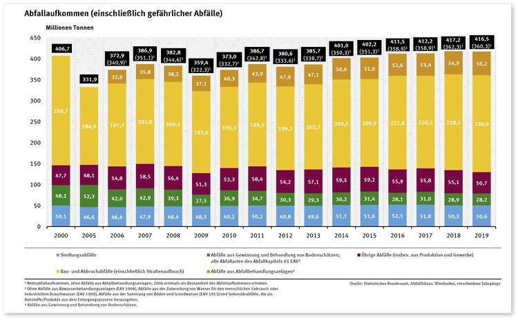 Der Bausektor ist der mit Abstand Abfall- und ressourcenintensivste Wirtschaftsbereich. Laut Statistischem Bundesamt haben Bau- und Abbruchabfälle im Jahr 2019 mit rund 231 Millionen Tonnen über die Hälfte des gesamten Brutto-Abfallaufkommens in Deutschland ausgemacht. Bei einem beträchtlichen Teil davon handelte es sich um mineralischen Abfall, der laut einem Monitoring-Bericht der Kreislaufwirtschaft Bau zu rund 90 Prozent als Bodenaushub und mineralischer Rohstoff verwertet wurde.