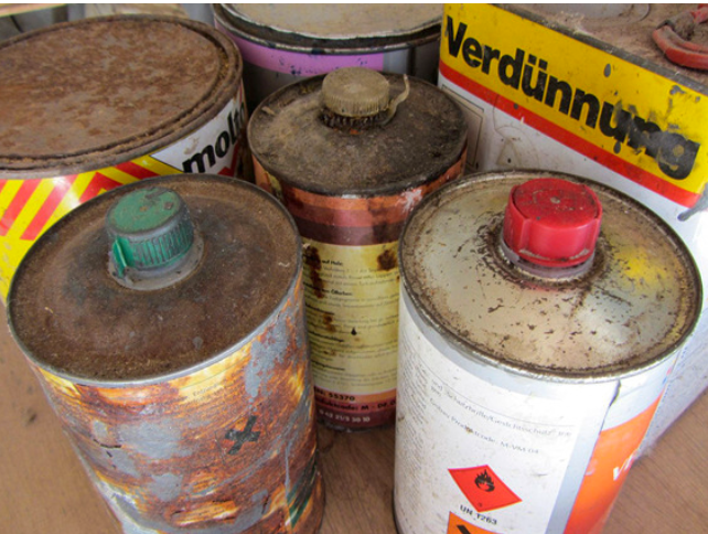 Flüssigkeiten wie Farben, Imprägniermittel, Laugen, Lösemittel, Säuren, Schmierstoffe oder Säuren können den Boden, das Grundwasser und die Luft verseuchen. Sie dürfen deshalb nicht über die Restmülltonne oder das Abwasser entsorgt werden. Diese Problemstoffe müssen in speziellen Behältern gelagert und über gewerbliche Entsorger beseitigt werden. Bohr-, Säge-, Schleif- oder Schneidöle lassen sich wiederaufbereiten.
