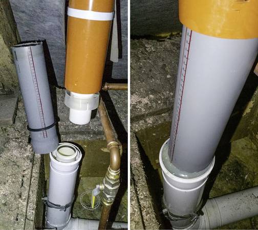 Der Anschluss in die Fallleitung war mittels Flex ausgeschnitten worden Der 50er HT-Bogen wurde dann eingepasst und mit Silikon verschmiert. Das müffelte dann zwar ständig und war nicht ganz dicht, aber man kann nicht alles haben. Vielen Dank, Daniel E.!