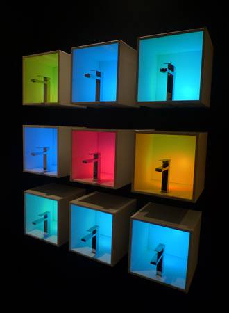 Die Daniel Rubinetterie inszeniert hier in wechselndem buntem Licht ihre Armaturen. © haustec.de/Andrea Bauer