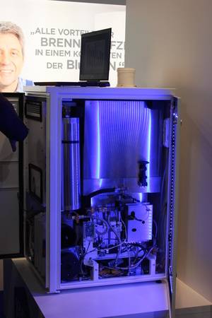 Aus Gas wird Strom: Brennstoffzellentechnik von BlueGen farbintensiv in Szene gesetzt. © haustec.de/Oliver Janßen