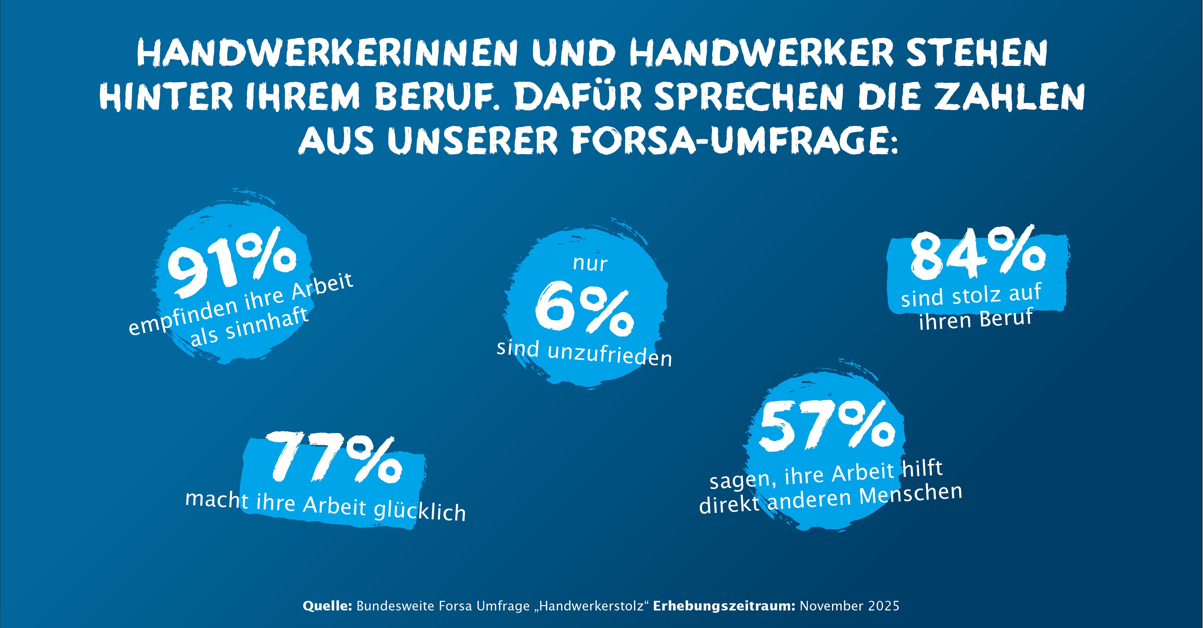 Blaue Infografik mit Prozentwerten zur Arbeitszufriedenheit von Fachkräften im deutschen SHK- und TGA-Gewerbe. Ideal für Entscheider in der Gebäudetechnik.