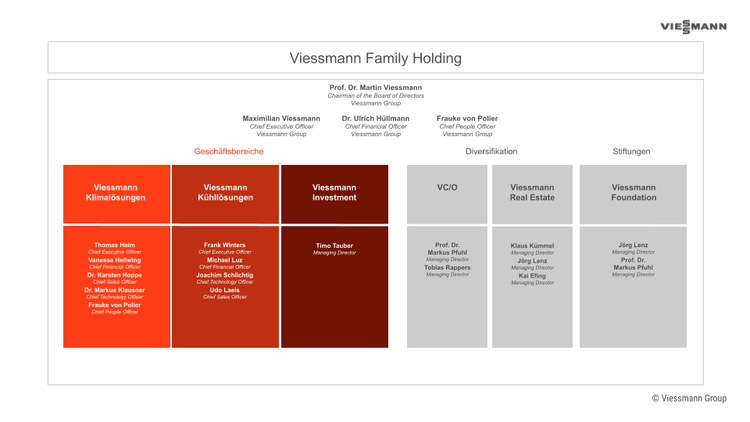 Das fünfköpfige Führungsteam des größten Geschäftsbereichs der Unternehmensgruppe hatte sich mit der Fokussierung von Maximilian Viessmann auf seine Rolle als alleiniger CEO der Viessmann Group zum 1. Juli 2022 um Thomas Heim (CEO), Frauke von Polier (CPO) und Dr. Markus Klausner (CTO) neu formiert.