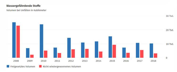 Die freigesetzte Menge wassergefährdender Stoffe war um 450.000 Liter oder 4,2% geringer als 2017. 3,2 Millionen Liter der freigesetzten Schadstoffe konnten nicht wiedergewonnen, anschließend genutzt oder ordnungsgemäß entsorgt werden. Sie schadeten der Umwelt dauerhaft.