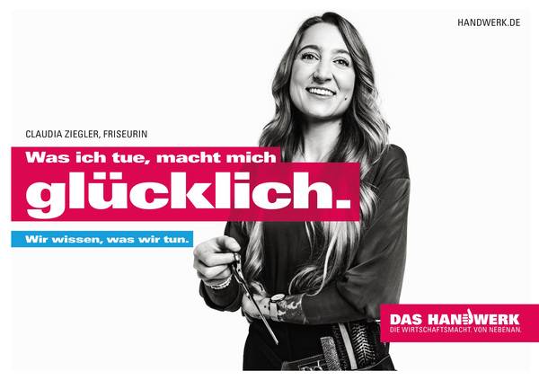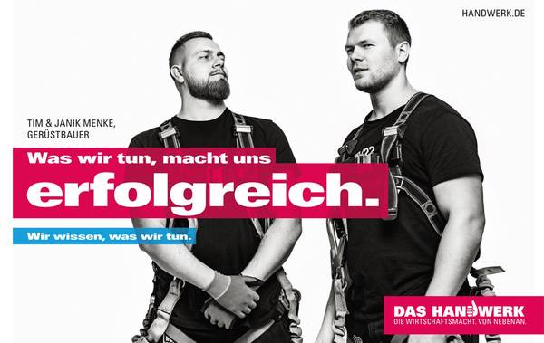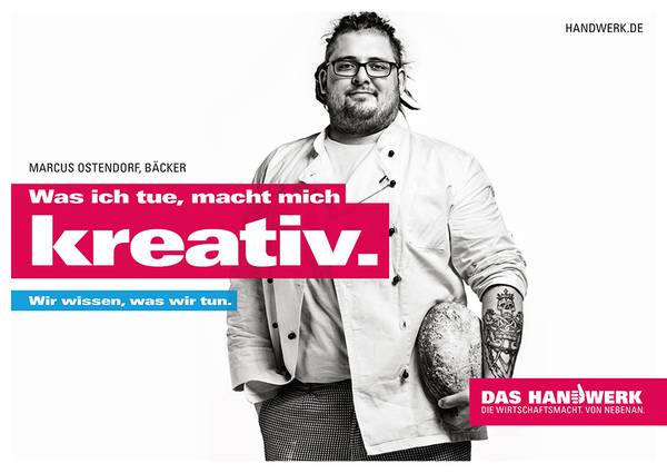 Ob kreieren, bauen, verändern, bewegen, pflegen oder reparieren: Das Handwerk bietet ideale Voraussetzungen, um individuelle Begabungen auszuleben und über das gesamte Arbeitsleben hinweg weiterzuentwickeln. Auf dieser Erkenntnis baut die dritte Kampagnenstaffel des Handwerks auf. Unter dem Motto „Wir wissen, was wir tun“ vermitteln ausgewählte Kampagnenbotschafter, vom Bäcker bis zum Tischler, ihre positiven Erfahrungen. Stellvertretend für über 5 Millionen Handwerker in Deutschland erklären sie, wie und warum ihr Beruf ihre Persönlichkeit positiv formt.