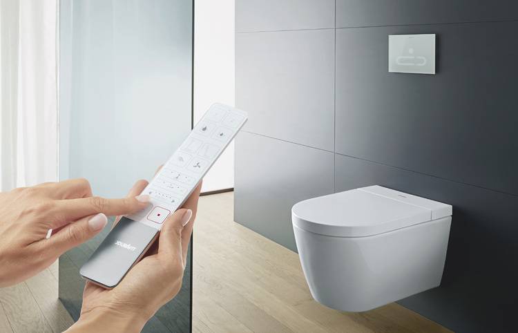 Mit der zugehörigen SensoWash-App wird das Duravit Dusch-WC individuell konfiguriert oder sogar gesteuert. In Kombination mit dem abgestimmten Vorwandelement von Duravit und der elektronischen Betätigungsplatte A2 können zusätzlich die Spülung sowie die Geruchsabsaugung per Fernbedienung oder App betätigt werden.