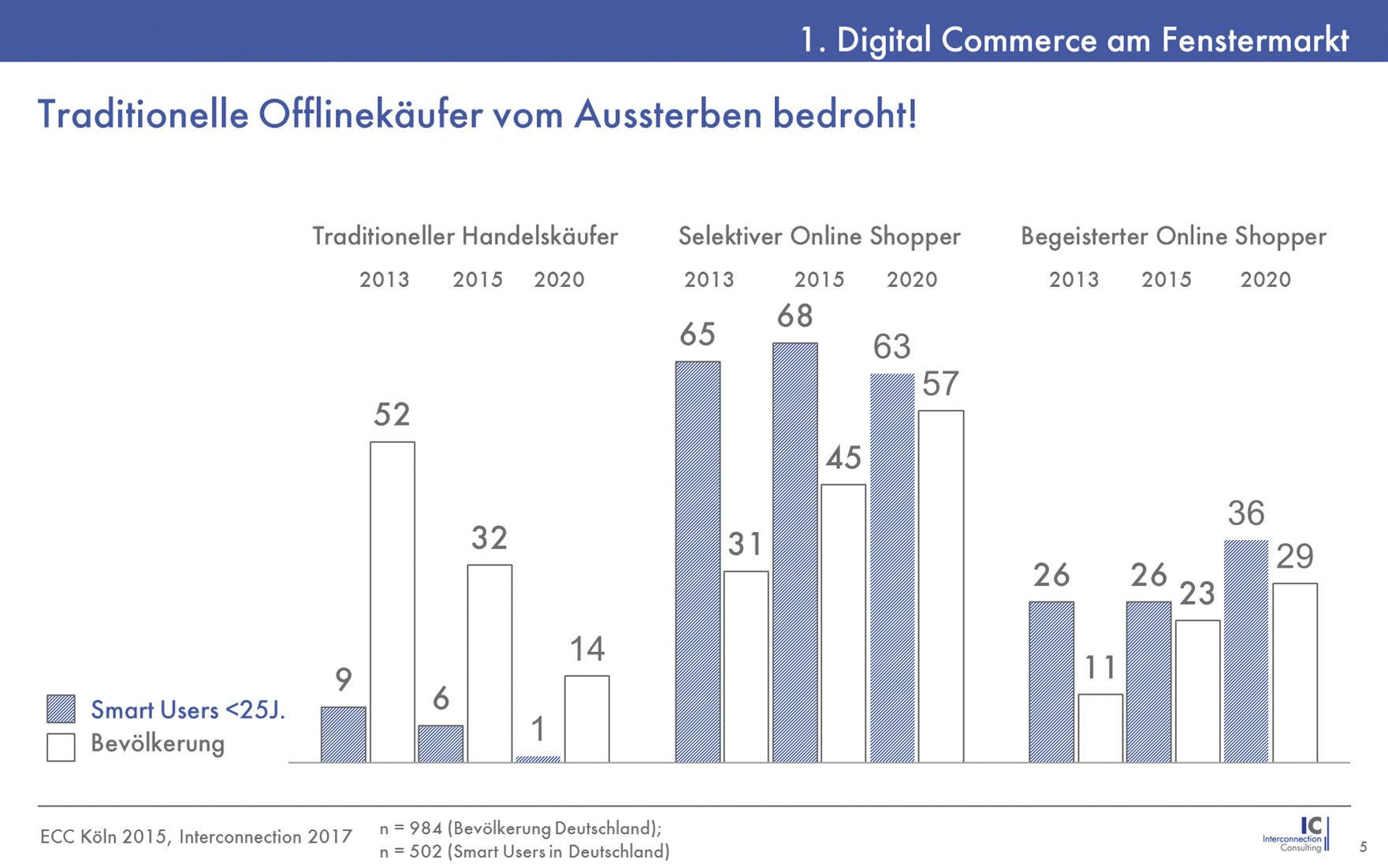 Die Generation der heute 20-30-Jährigen, die mit Online-Handel groß geworden sind (Digital Natives), haben dabei ein ganz anderes Einkaufsverhalten, als ältere Generationen, die noch großen Wert auf persönlichen Kontakt legen. Klar ist aber auch, dass der traditionelle Offline-Käufer ausstirbt.